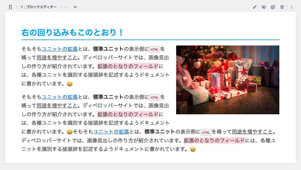 エントリー内の各ユニットはブロック要素として出力されています。ユニット単位では、どうやっても回り込みはできません。ブロックエディターも同様。エディター内で画像とテキストを入力すると、それぞれ幅100%のボックスで表示されるため縦に並びます。