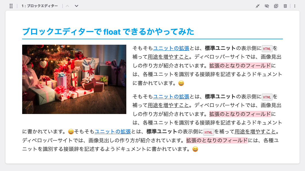 ちょっと難点だったのは、編集画面でブロック左側[+][⋮⋮]が操作できないことがあったこと。回り込み表示するように admin-editor.css に追記したところ、float した際の重なりが原因なのか移動もコンテキストメニューも出せませんでした。