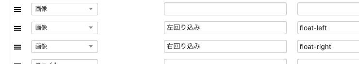 画像ブロックを追加し、ラベル「左回り込み」、クラス「float-left」を設定。同様に「右回り込み」も作成する。